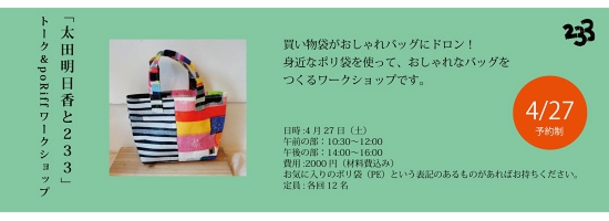 『福祉施設発! こんなにかわいい雑貨本』を作った淡路島出身のライター・編集者の太田明日香さんトークショー&ポリ袋からおしゃれバッグをつくる「poRiffワークショップ」(講師:薮内都さん)です